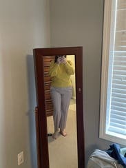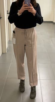 Wore these pants with the matching blazer for a big work presentation. Color is gorgeous and I love the blend of formal and casual thanks to the front creases and drawstring. These were pretty large on me and I had to pull the drawstring tight to feel confident they weren’t going to slide off. Next time I’ll size down.