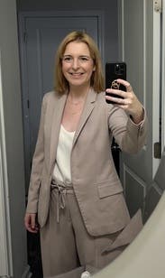 I enjoyed this suit for work travel. Elastic wait made it comfortable enough for flights and all day meetings. Color was more fun than the standard black/grey/navy suiting. Funny thing is I got the jacket in an 8 and pants in a 10… jacket was too small and pant fit GENEROUSLY (too large). Wish I had been able to reverse that sizing. Paired with matching jacket, bright sweater and flats.