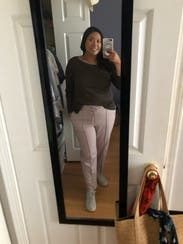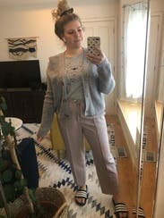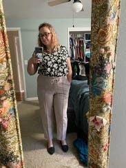 I really liked these! They were super comfortable and stretchy - it felt like I was wearing professional sweatpants. The line down the centers of the legs adds a trouser-like element that elevates the look. The pants are a pale pink with some faint plaid detail. I wore this a few times - with a navy long sleeve blouse, olive green long sleeve blouse, and multi-colored (but mainly cream, navy, green, pale pink) blouse.