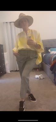 Yellow top, black Vans… rolled the waste down to make a more snug fit, adding a color block pop of black. Straw hat with black ribbon and gold circle sunnies with gold chain/fastener. Stylish for the fashion side of horse racing, where I’m also a photographer; I am up and down, back and forth the track taking photos. This outfit made me happy