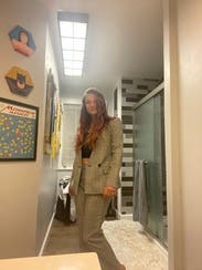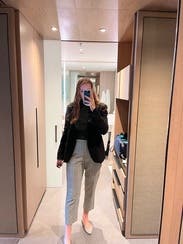 I wanted to try this capri length, wide leg suit look, and I liked this suit for that reason - it did a good job of representing what I'm seeing in magazines. I didn't notice until at work, but there's zippers to flare out the bottom of the pant. That look didn't really suit me, but I would have rocked it had I worn it with some boots. I thought the fit was good. I'm a true 4, so if you're between 4-6 I would size up. It also has the double button clasp, which I appreciate to avoid bunching