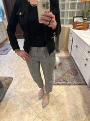 I tend to fear plaid pants. Too big and the pattern overwhelms me or makes my hips look larger. I'm glad I sized up after reading the reviews. The pockets would not have laid flat had I worn my normal size 6. These looked great with solid colored sweaters but I loved wearing it best with a simple off-white silky blouse.