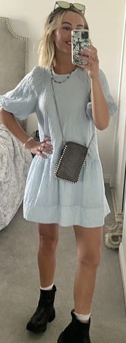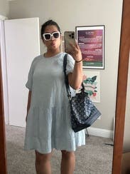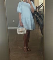 Fun, flowy dress in a pretty blue — the style is baggy. Wore with white sneakers. I like that it was lined. Arms were a little tight! Also it was a little short in length for me but it’s the style.