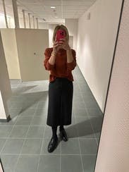 It wasn’t available in my size so I sized up. Tempted to keep it but will wait to see if my size is available next month. This is the perfect skirt: skims the body and falls to a great length.