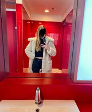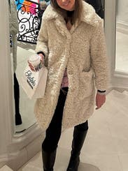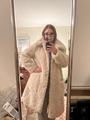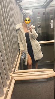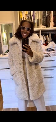 It's very cozy, and definitely warm, but wow, it's also really heavy! 5 pounds is a lot to carry around if you plan on wearing it walking around town or shopping. Because of that, it felt super bulky. I normally wear a S, but I ordered a M for extra room under sweaters and wintery clothes. It wasn't necessary, this was HUGE on me, so I probably could have sized down to an XS if it were available. For a luxurious winter white look, I paired it with GREAT JONES RIBBED SWEATER SKIRT, a Jennifer Lopez Sparkly Camisole, and ASHLEY PARK X RTR LONG FAUX FUR CARDIGAN I found the jacket to be very cozy and warm, but it was also quite heavy. It weighed 5 pounds, which may be too much to carry around while walking or shopping. I usually wear a size small, but I ordered a medium for extra room to wear it over sweaters and winter clothes. However, I found the medium to be huge on me, so I could have gone for an extra small if it was available. To create a luxurious winter white look, I paired the jacket with the Great Jones Ribbed Sweater Skirt, a sparkly camisole from Jennifer Lopez, and the Ashley Park x RTR Long Faux Fur Cardigan and suede camel boots. Although it was fun to wear, I wouldn't rent it again