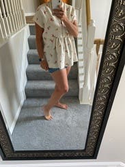 This was a super cute, flowy too great for spring. The material is breathable but not the softest. I'm 145 5'4" and got a S and could've been smaller.