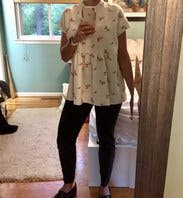 A bit tent-like for Maternity, but I loved it! I hate tops with side ruching and wanted to try to avoid them whenever possible. This is an interesting fabric and a very large, flowy fit. I got a ton of compliments and rented it twice at 25 and 30 weeks.
