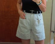 I was surprised how much I love these shorts. The flared leg makes the waist look small so front patch pockets don’t seem to add volume. Fabric is thick and stiff, so flare is permanent and fabric stays away from your body to provide nice air cooling effect. Patch pocket keeps phone or whatever on hand. I wore with chambray shirt, or black tank, or floral silk halter, for lots of different looks. My only wish was that they weren’t so darned expensive to buy!