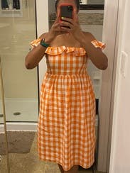 The dress was the perfect one for a Saturday full of tailgating and cheering on the Tennessee VOLS. It runs slightly large so size down if able, even with a large chest. A strapless bra works perfectly. It has pockets and looks great with tennis shoes.