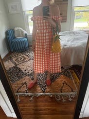 Not everyone's style but I really loved this dress and got lots of compliments! Wore it over the shoulder but it looked very cute off the shoulder as well. It does have an inner layer which adds a bit of volume to the skirt which I didn't necessarily love, but I was able to tame it with a steamer so it didn't look so poofy.