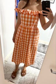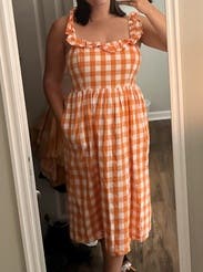 Felt like Anne of Green Gables is this dress! Love the print, orange looks so refreshing! Fits great. Not tight is the chest. Length mid calf. Great dress ti wear on a hot summer day. Cute ruffles up top. Only trouble is that the ruffle upfront would flip up all the time. So I pinned it too the dresses and that fixed the trouble. Loved wearing this dress!