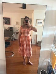 Looking like I’m going to a church picnic. Lots of compliments from ladies 40+. Too loose due to the stretch component on the back -also where the zipper is. Very comfortable and easy casual dress. Maybe with a smaller size I could wear the straps down like on the model