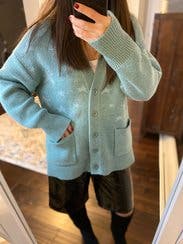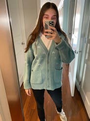 On trend cute cardigan! Really comfortable and warm. I agree with another review, I got this brand new and it started pilling very quickly. Very slightly itchy, I'm not very sensitive so if you are maybe pass on it. I wore with skinny jeans and sneakers in another outfit and it was really cute! It seems too thick to tuck in like in the model pictures