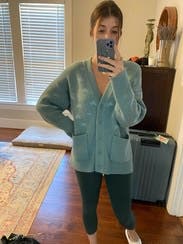 Great color and super cozy. Not very flattering though, my husband called it my mister Rogers sweater.