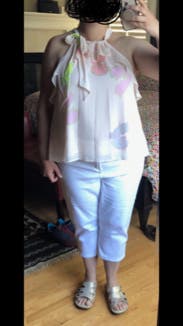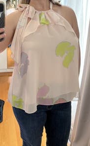 I loved this top. Initially planned to wear with white pants, but wore it with jean shorts as it was SO hot out - it really looked cute. It was very light and a beautiful color. The neckline worked well with a convertible bra. Overall I really liked this one. I would consider renting again for another day time party throughout the summer.