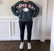 The Daydreamer Game Day Crew Neck Sweatshirt is a sporty piece with a bold puff-ink logo and a relaxed, boxy fit. For a versatile look, style it with jeans for a casual outing or with a mini skirt and sneakers for a playful touch.