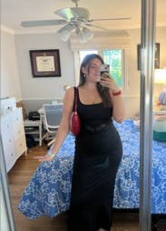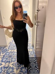 classy, simple, comfy black dress that was perfect for a rehearsal dinner. very flattering fit!!! I loved the little lace cutout around the waist — it made it feel more fun than your average black dress. would definitely rent this one again.