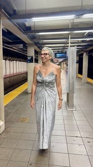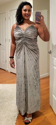 This was a backup dress that RTW sent me after my first rental didn’t fit. Boy, am I glad the first dress didn’t work because I was thrilled with this one! I wasn’t sure how the silver tone would look with my skin/hair color, but it is one of my favorite formal dresses ever! It fit perfect, wasn’t too long, (I am 5’3) and was super comfortable. I received tons of compliments and I’m tempted to purchase it. FYI: I normally wear a size 2 and the xs was just right.