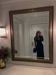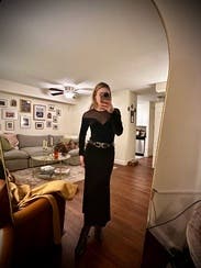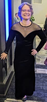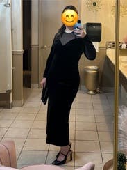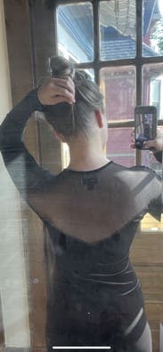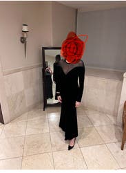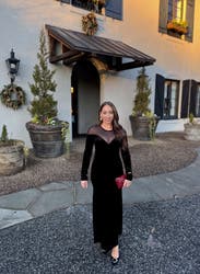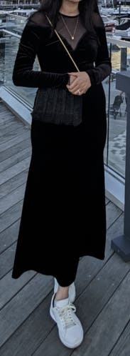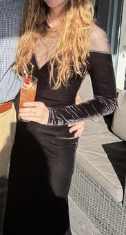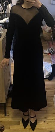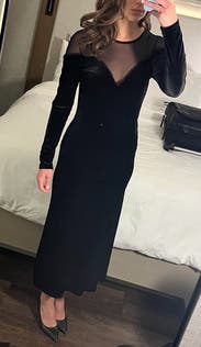 Wore this to a black tie November wedding and it was perfect. Cut is super flattering, fabric’s thick enough that I skipped the shape wear, and loved the mesh/velvet combo. The neckline made the dress! And I was comfortable all night. Would rent again 100%