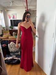 Red (90% Polyester, 10% Spandex). Gowns. Strapless. Sleeveless. Back zipper closure. Shoulder to hemline length 58". Made from imported materials, finished in the USA. Country of origin designation as provided by vendor and/or manufacturer.