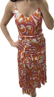 Multicolored printed satin (51% Viscose, 49% Preconsum). Slip. Sleeveless. V-neck. Back zipper closure. 46" from shoulder to hemline. 15" adjustable slit. Imported.
