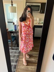 This dress fit me really well, but I have a smaller chest. The slit was super fun and the colors were very bright. Great for a date night!
