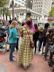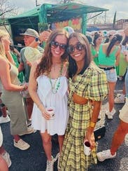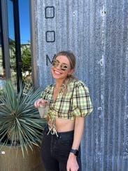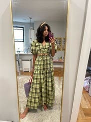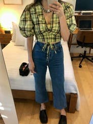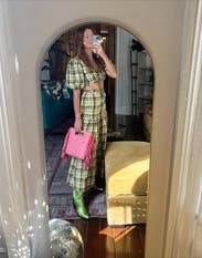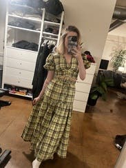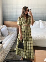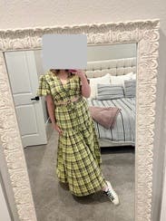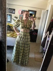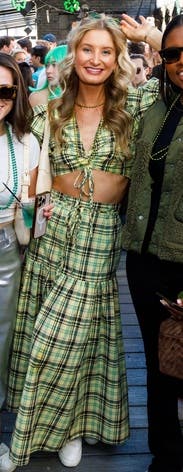 Wore this for a St.Patrick’s day party and received non-stop compliments. Dressed it down with white sneakers to fit the day party vibes. First true to size, but the top is tight! If you have a smaller chest, this is a great option. If you’re bigger, I would size up 1-2 sizes. The tie strings allow you to make it more or less cropped. There are no additional ties or zippers to help get the top on or off so make sure to keep that in mind when doing your hair/makeup. The fabric (didn’t wrinkle) was more yellow rather than green, but absolutely loved the chic Irish vibes it gave off.