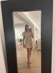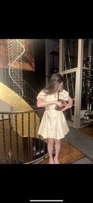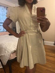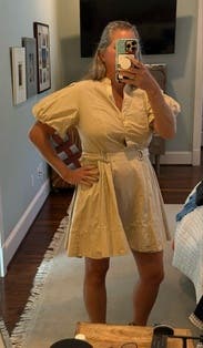 This is a cute little dress with some fun sleeves for flair, but the belt is pretty odd to figure out. Not sure I would rent again, but got plenty of compliments. Didn’t pull at the chest, which is always nice!
