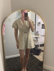 I rented this dress for work in summer. Loved the color, sleeves, ability to tighten with the belt and how breezy it was. I got compliments on the dress at work too!! The only surprise was how short it was. I took a photo in heels here but ended up wearing flats because I felt my legs were too exposed for this particular work day.