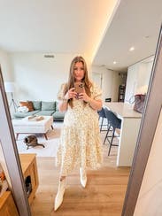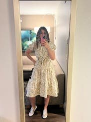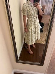 Great fabric weight. Flattering cut, muted floral pattern. Versatile (flats, sneakers or heels). Wore this on a warm fall day.