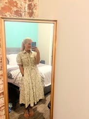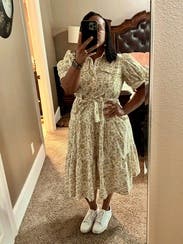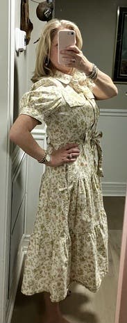 Felt cute hosting a breakfast for friends in this dress. Forgiving fit due to the tie around the waste, and easy to style. Although I think the colors work for fall, it is hard to pair with a sweater with the puff sleeves.