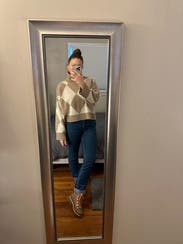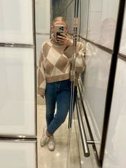 The cut and pattern of this sweater is great with high rise jeans or pants.
