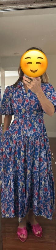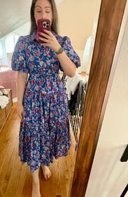 Love the cotton fabric, pockets, beautiful colors and pattern. Not a fan of the ridiculous over-sized poof sleeves; only drew more attention to my broad shoulders and large bust. Regular shirt dress sleeves please! The empire waist draw strings pull in right below my bust which I don't like.
