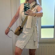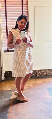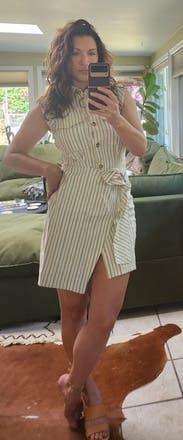 I wore this to a work event on a yacht. I liked it, but I wouldn’t say I was in love. I steamed it 3x and it immediately wrinkled right back. Tight in the chest area if you have larger boobs.