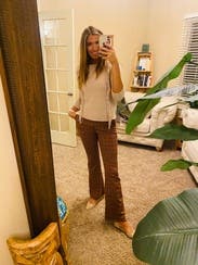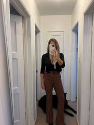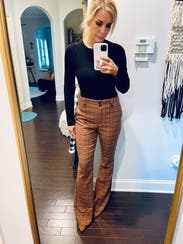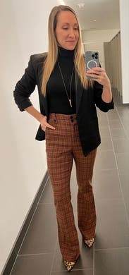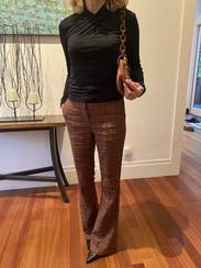 Plaid pant looked professional, stylish and was super comfortable. Material is thin and gives a lot yet hugs in all the right places. The plaid is subtle which I liked. Size ran TTS if not a little on the larger side. Pants were long on me but I wore 3” sandals which put them at the perfect length for me.