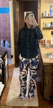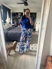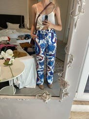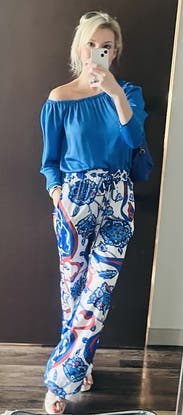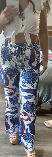 Loved these! Bright, fun pattern and pretty comfortable. Felt like I should be hopping on a plane to Greece rather than going work. They’d be great for vacation, a nicer casual pant. I wore to work since it’s summer and I’d rent them again.