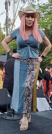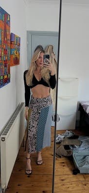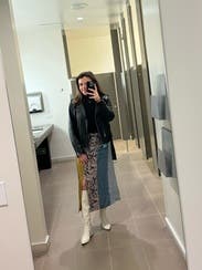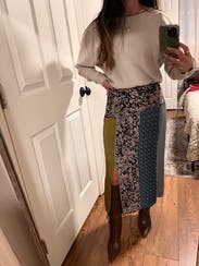 Not my typical style, boho? But I tried it as it seemed a darker, edgier print - I loved it! It is well made, lined & heavier weight luxe fabric, sits lower & the slit gives it some edge. Worn with a black boxy T tucked in & retro sneakers during warmer weather, then with patent combat boots & leather jacket for work. Considered purchasing, feels great just putting on.