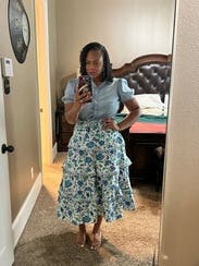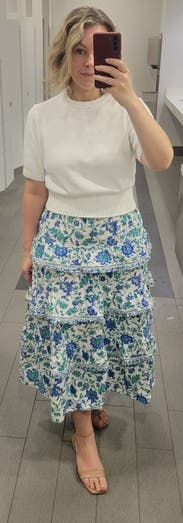 I received so many compliments around Dallas. I wore the matching shirt untucked and belted around my waist. I initially tucke din top but the drop waist with low first ruffle made it look odd to me. I am buying the set its too cute! For reference skirt size 10 top size 12