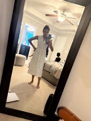 Wore this to a daytime event with a bold belt and sneaker to a bold belt and matching wedge. Very versatile.