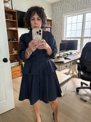 Great work dress. Fits TTS. Felt different and yet still work formal appropriate. I did not like the hanging strings, they’re not removable. And if you wear it buttoned to the top and tie in it a bow, you look like a waiter. So getting rid of the strings would be my only edit to make it perfect.