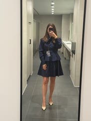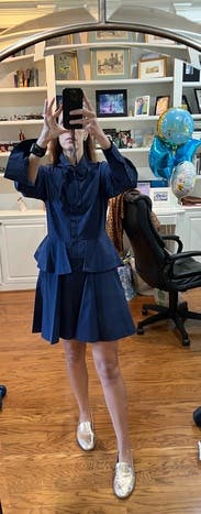 This dress reminds me of the girls school in Harry Potter 4. Good length for work. TTS. One star off because I couldn’t figure out the tie and ended up just doing a bow.