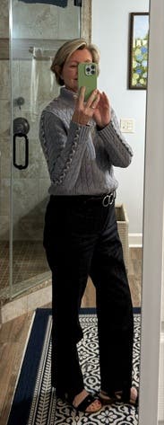 The piping on top of the sleeves was less flattering on my broad shoulders. It’s a nice sweater but not my favorite for my body.