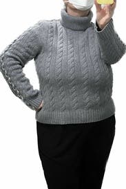Gray knit (100% Wool). Sweater. Long sleeves. Turtleneck. Pull on. 22.5 from shoulder to hemline. Imported.