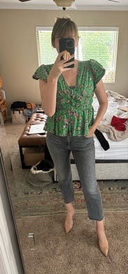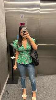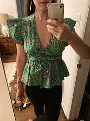 Very cute top! Loved the structured shoulders/ruffles, lots of compliments! Only trick is that the top is quite low cut - I wore a nude colored flat seamed bralette underneath which disappeared/ blended in with my skin so it wasn’t super obvious, but I felt a little self conscious at work. Great color and style.