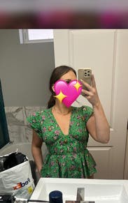 Love the style, color and print. Fit everywhere but the bust. Too much cleavage for a mom, IMO. I threw a cami under it but would have been more comfortable in the next size up.