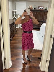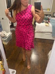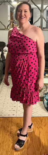 Dress was so much fun to wear. The polka dots really brought it to life. Was able to dance the night away. It was just a little big at the top. I wore a clear strap bra. Another dress that got many compliments!