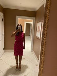 Wore it to go watch the barbie movie and loved it. The material is light and very flattering. I have no hips but the draping gave me a shape and I added a black belt to accentuate my waist. The ruffles at the bottom move perfectly when you move and there is a perfect slit to give it a little bit of sexy. Loved it. Very light fabric so great for a hot day. Loved wearing it and I would definitely rent again.