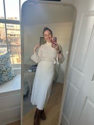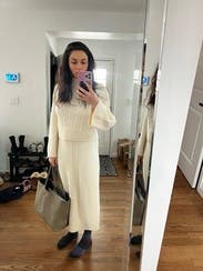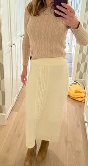 Loved this set. Perfect for vacay in the alps. The skirt was warm enough with mid-calf boots and nothing else underneath, but I would've been OK to wear leggings underneath for added warmth. The waistband of the skirt was a little tight, but the sweater was loose and overall very flattering look