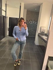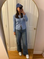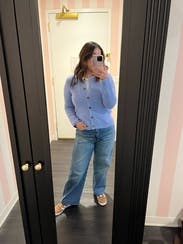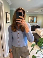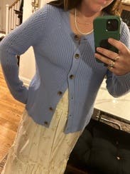 I LOVED this thicker, sturdy light blue sweater. It is breathable and looks cute buttoned up or over a tee. I wore it so many times and will definitely rent again.