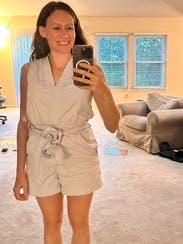 I liked this romper! It runs true to size. The material is a bit stiff and when you sit down the material in the chest area separates a bit. It would be good if there was an inside button higher up to prevent it from opening. It would be a good idea to wear a camisole tank underneath due to this. Other than that it was a great outfit for the day!